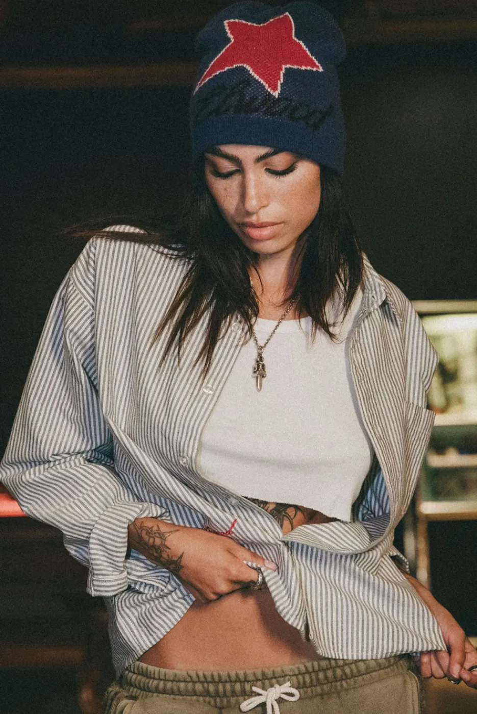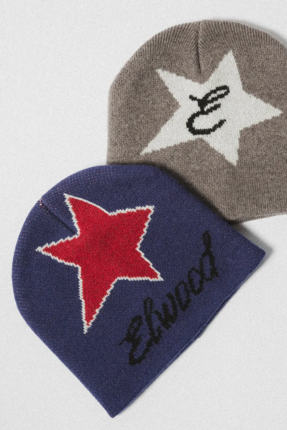 The Skull Cap Beanie is a bold accessory with a contrasting star motif and embroidery on the brown colorway. Just enough to keep things interesting. Available in Dull Brown and Navy.