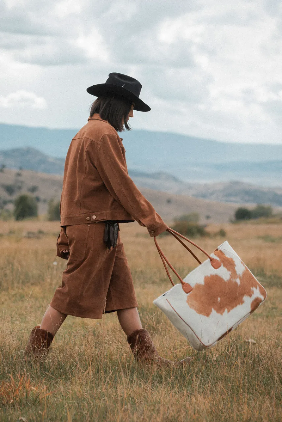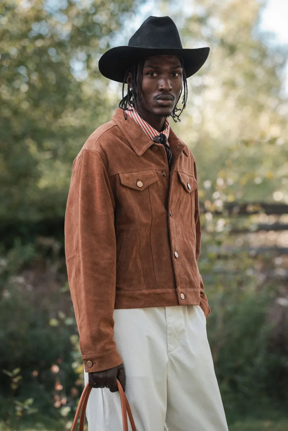 A classic Western jacket made from 100% genuine suede. Features tonal shank buttons, a slightly fitted silhouette, and traditional details. Available in Brown Suede.