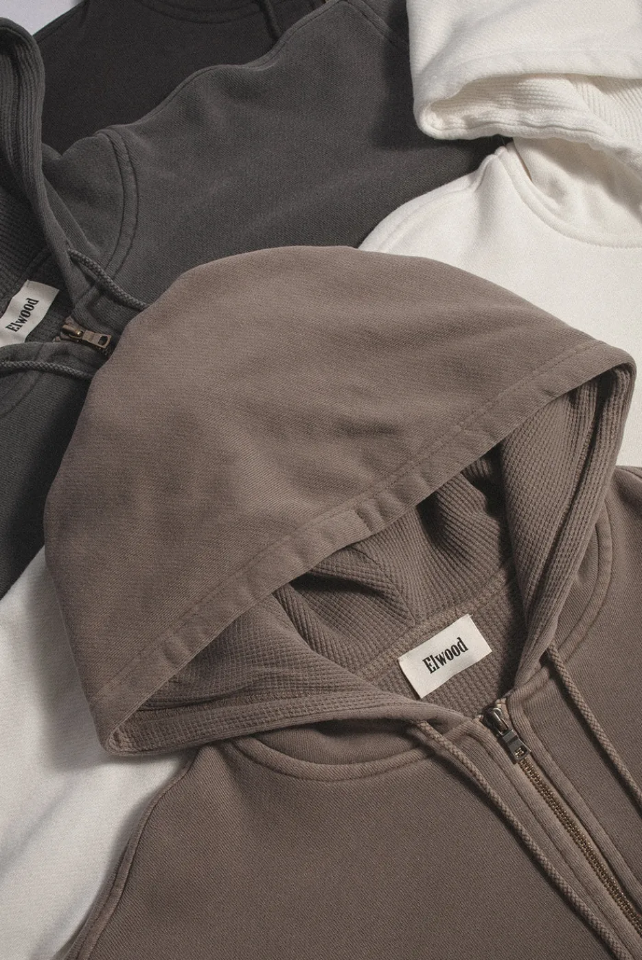 Our Core Zip Hoodie, updated with a cropped silhouette. Features front pockets and double thermal lining for extra warmth. Garment washed for a lived-in feel.