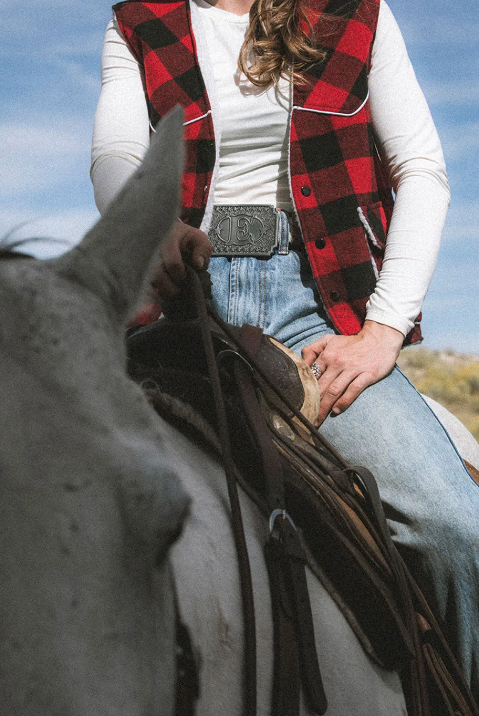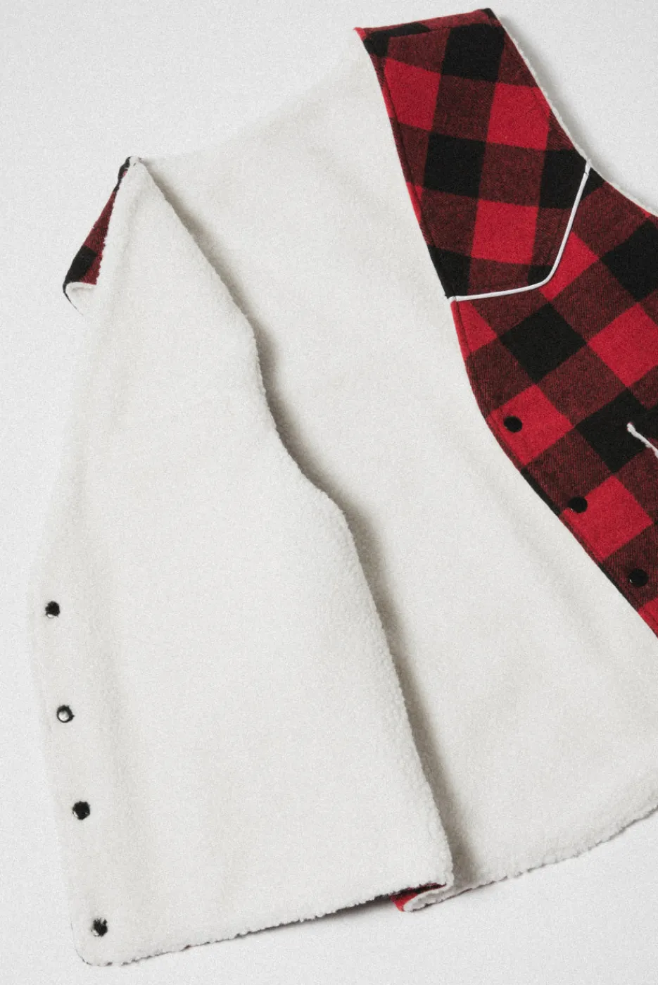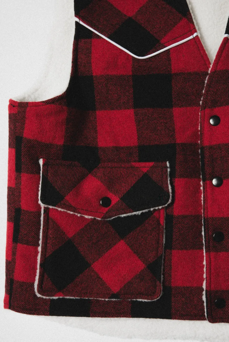 This reversible vest features plaid on one side and warm sherpa on the other, making it versatile and functional. It includes front piping, welt pockets, and snap buttons for a classic touch. Available in Buffalo Plaid.