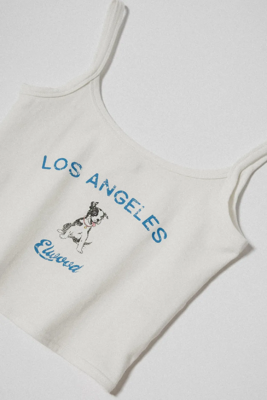 CAMI TANK The hottest days call for the Cami Tank. Cropped with contrasting spaghetti straps, each colorway features a custom Los Angeles-themed screenprint. Available in two colors.