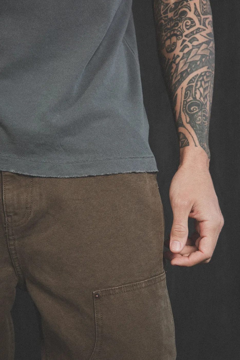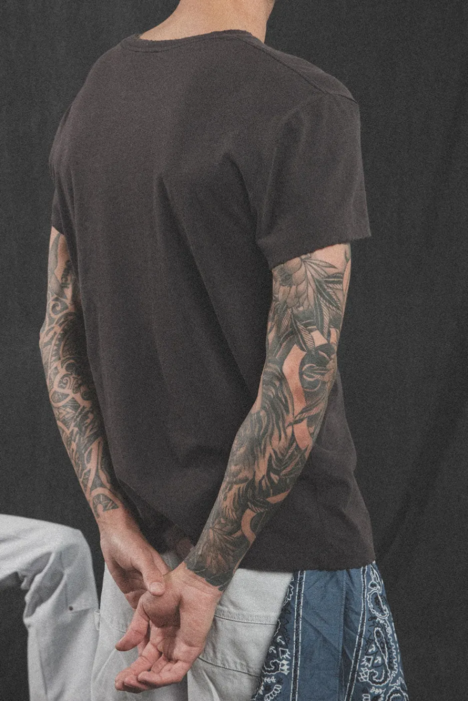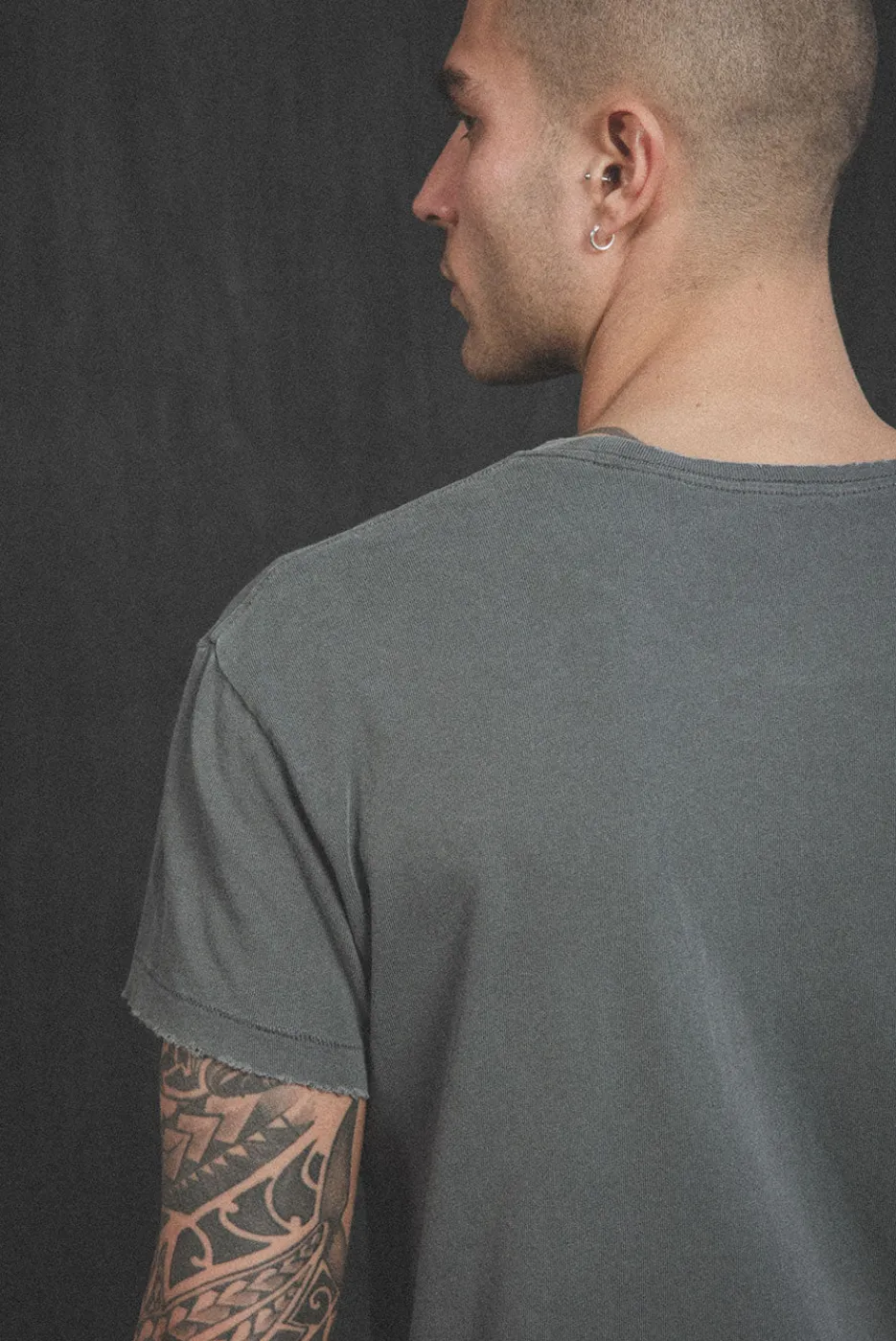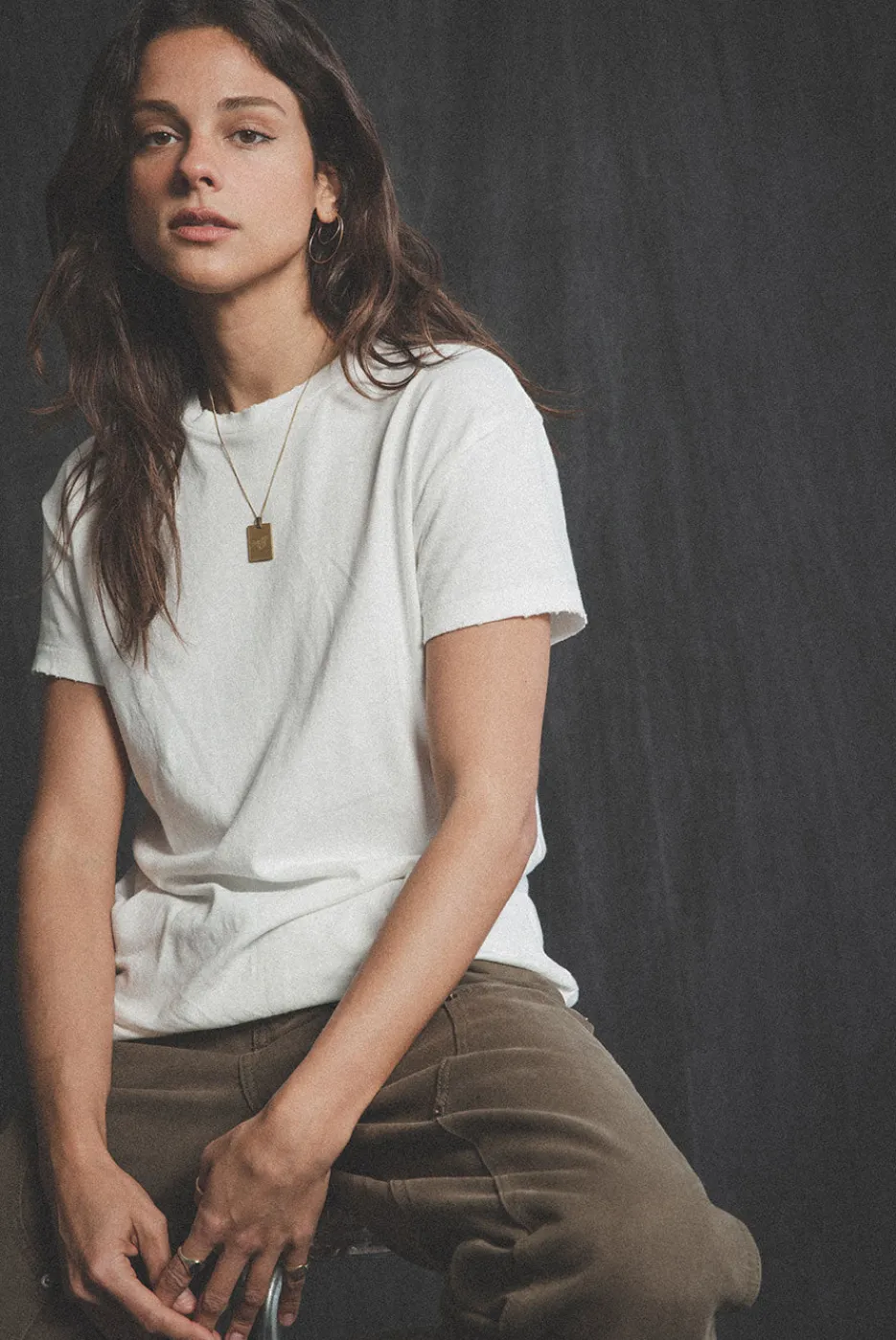 A vintage-inspired tee with a standard fit, cap sleeves, and slightly longer and slimmer proportions. Made with hand-distressed garment washed 100% cotton jersey.