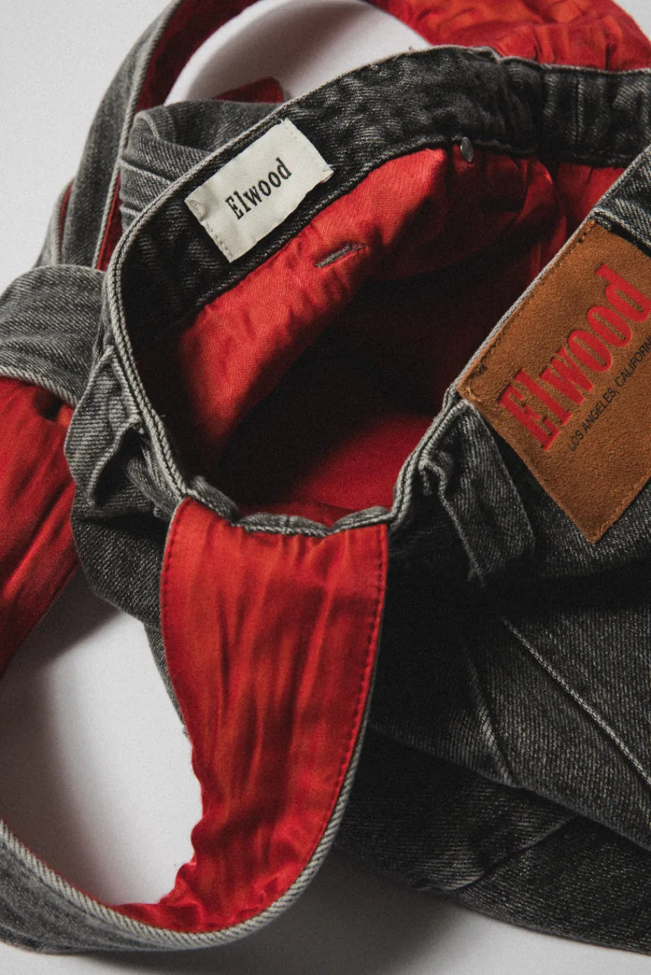 A bag made of jeans. The Denim Gunny Sack has functional pants pockets and a keyring on the belt loop for extra utility. Lined with red satin, just because it feels good. The top-tie strap is adjustable to customize the length. Available in Washed Black and Light Indigo.