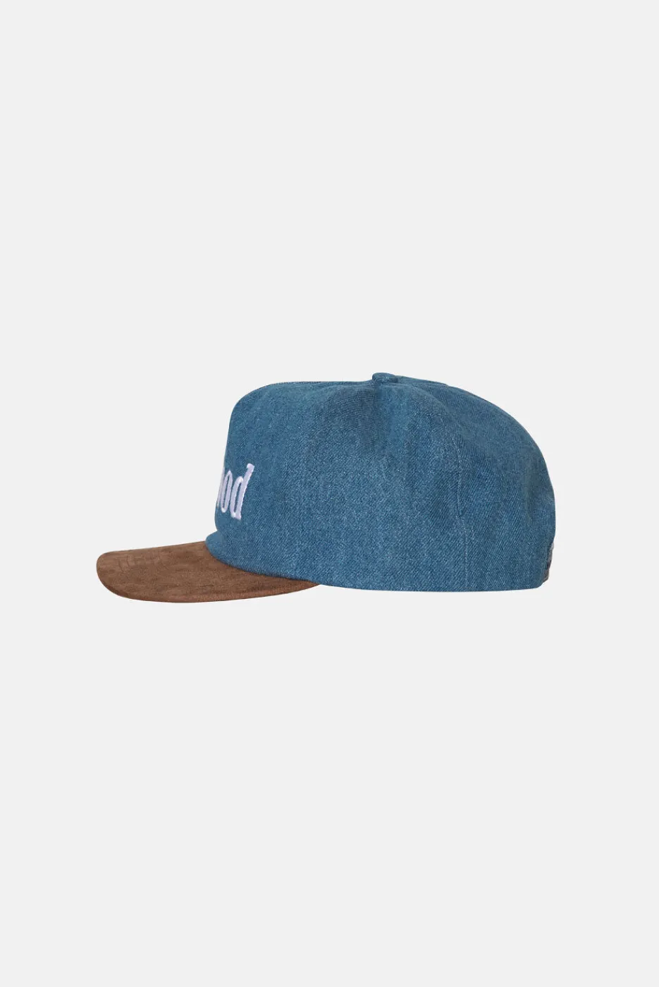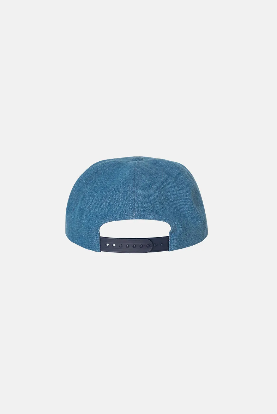 Our signature 5-panel Trademark logo cap, crafted from denim with a faux suede brim. Available in Indigo Denim.