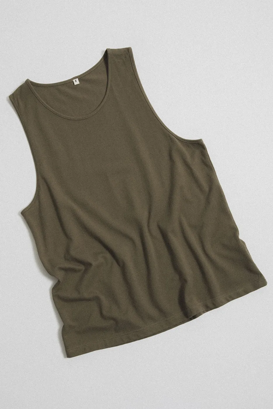 The Dodgy Tank is a loose-fitting layering piece. Crafted from breathable pique knit fabric, it features a wider cut and a billowy effect when tucked in. Available in Natural and Moss.