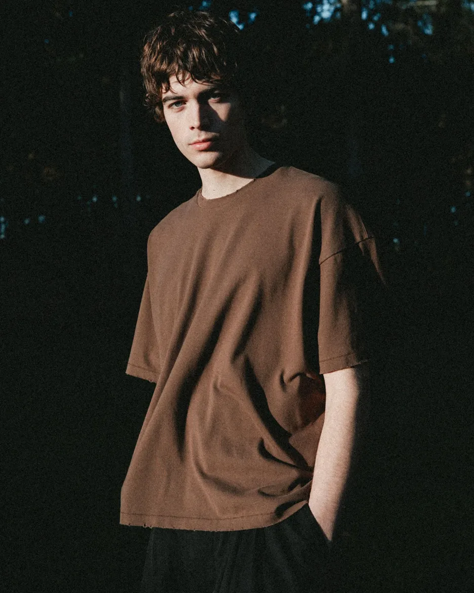 The Dodgy Tee is crafted from pique knit fabric and designed with an oversized, boxy fit. Finished with distressed edges on the neck and hem for a vintage-inspired, lived-in look. Available in Natural and Walnut.