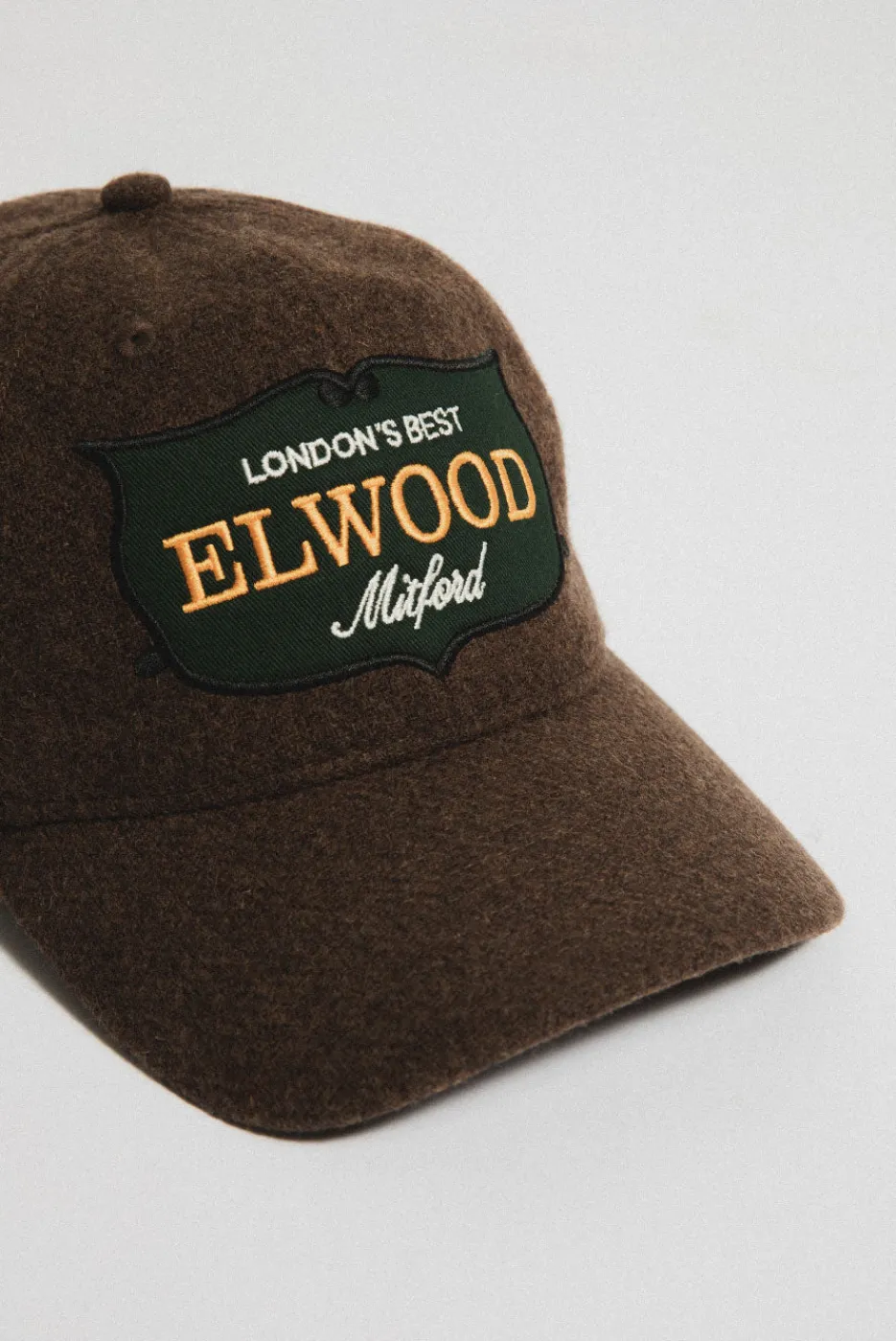 The English Dad Cap features an embroidered Elwood patch, a classic dad cap silhouette, and an adjustable leather strap for a perfect fit. Available in Brown Wool.