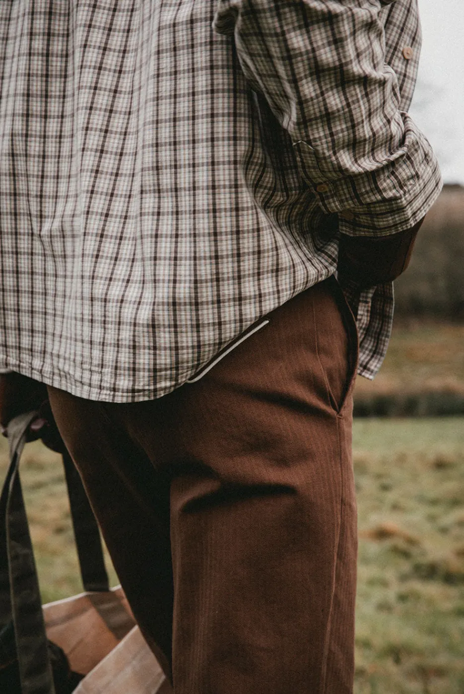 The Groundskeeper Pant is crafted from textured herringbone twill fabric for both durability and style. Features a straight-leg fit with subtle piping details on the back pocket. Available in Off White and Bark.