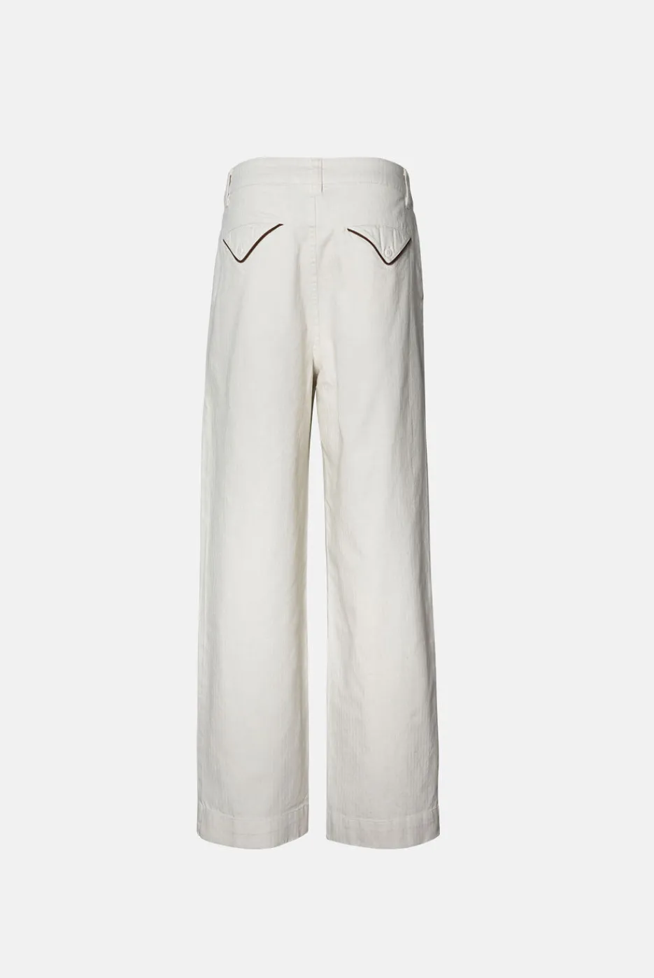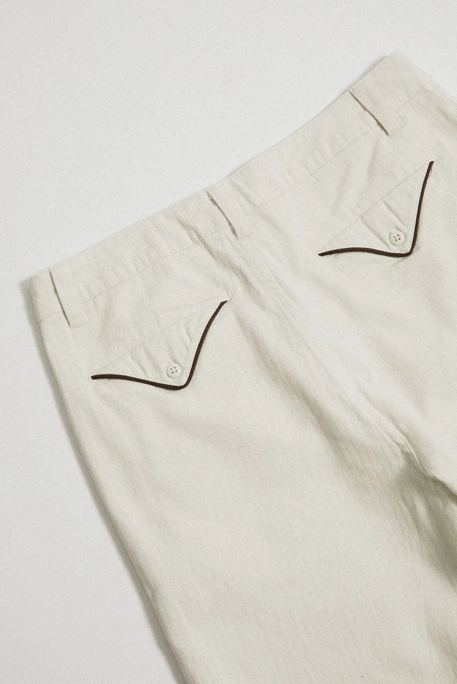 The Groundskeeper Pant is crafted from textured herringbone twill fabric for both durability and style. Features a straight-leg fit with subtle piping details on the back pocket. Available in Off White and Bark.