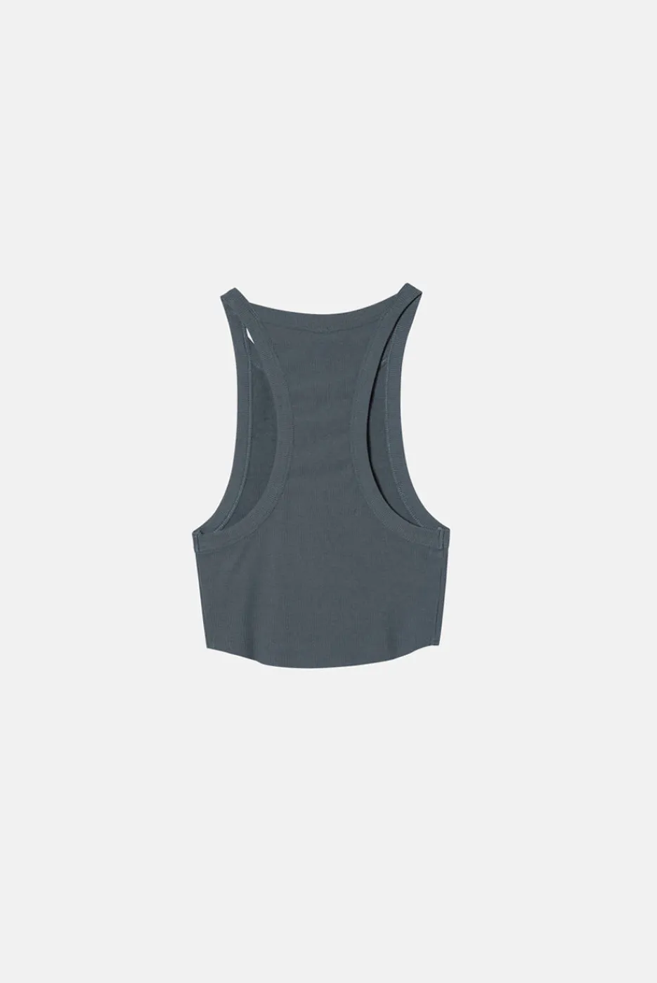 A racerback tank made from a thin, lightweight fabric with narrow straps. It features a high-neck design, roomy armholes, and a curved hem. Available in Lotus, Coal, and Slate.