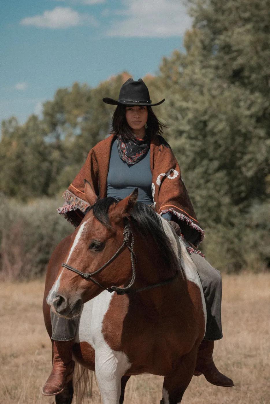 A spacious woven blanket with a stallion graphic, Elwood logo hit and fringe detailing. Add rustic flair to your space, or cozy up with it. Available in Rust.
