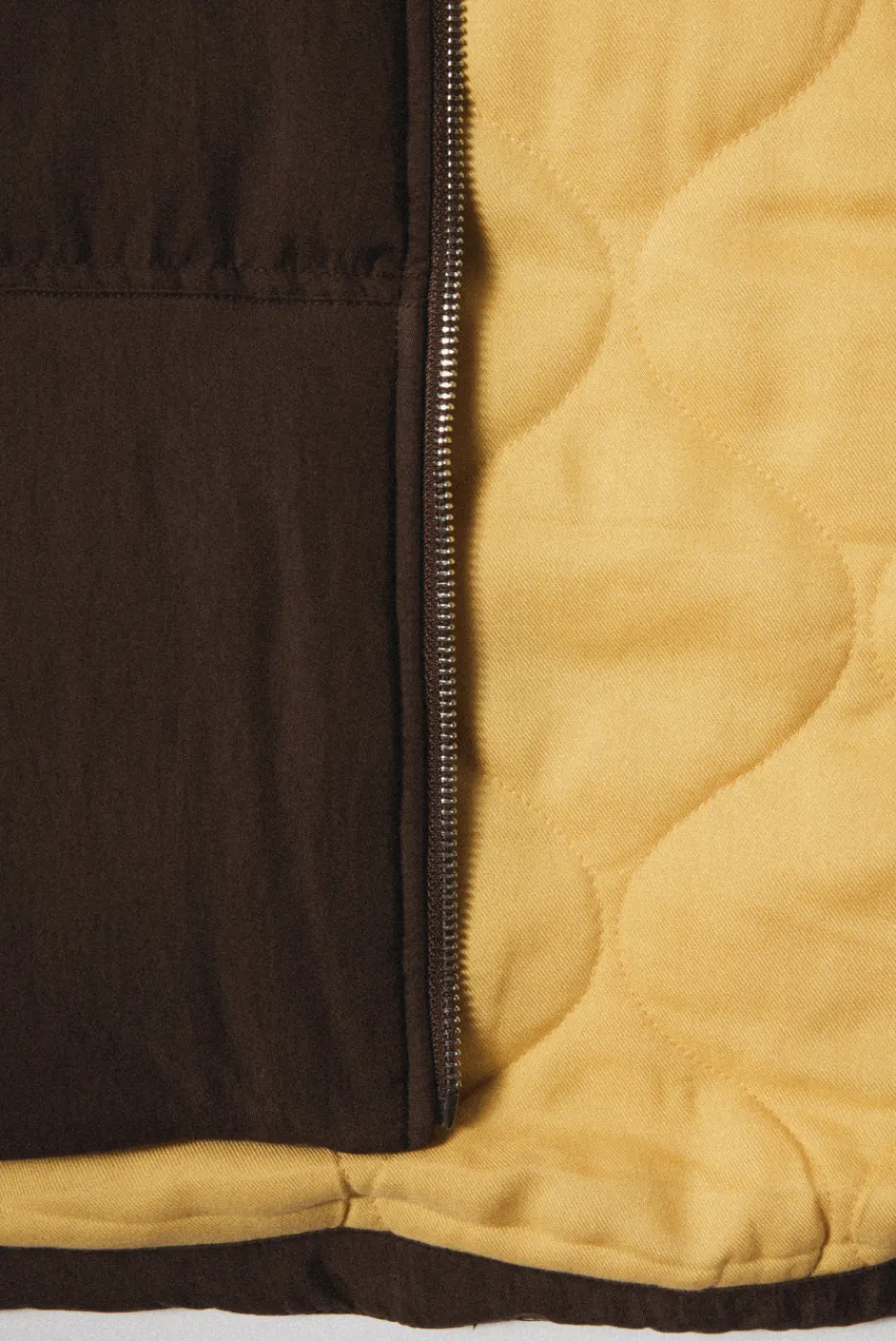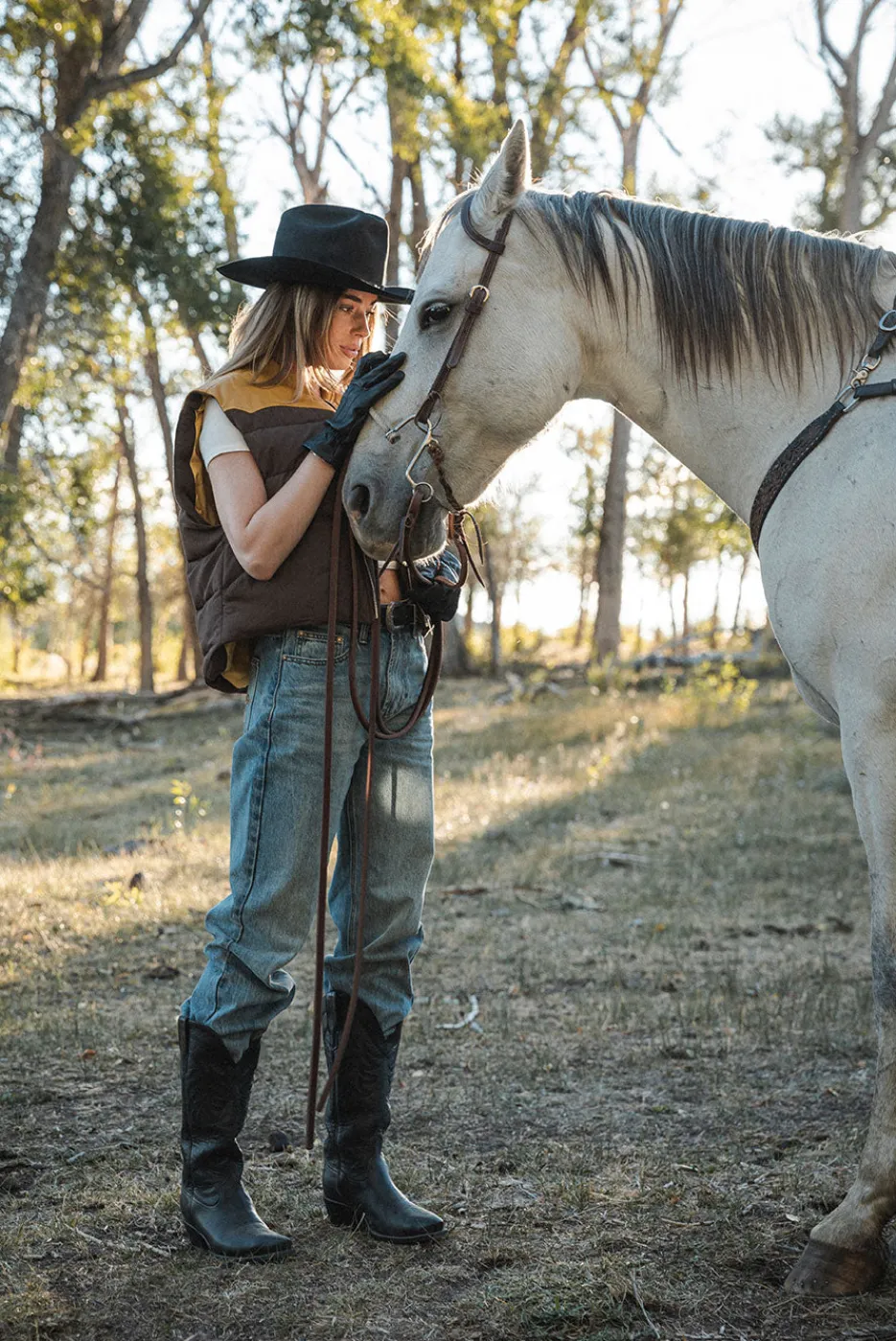 A bold puffer vest with a Western yoke, real leather accents, and a zip front. Designed with a pop of color, it’s filled for warmth and finished with a bright yellow lining. Available in Red and Tan.